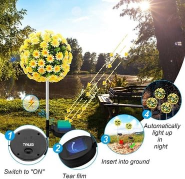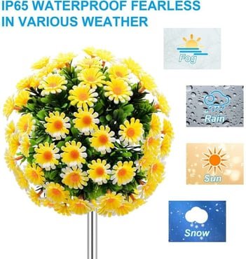 TWO MODE 7 COLOR LIGHTING: Daisy solar led outdoor lights with 7 color lights: red, green, orange, blue, yellow, purple, and white, the multicolored lights creating a surreal visual effect adds a charming display of lights, FLASHING and STEADY ON lighting two modes for choose make your surroundings look dreamy and magical.